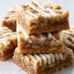 The image shows a close-up of a stack of eight dessert bars arranged unevenly on a white marble surface. Each bar has three visible layers: a golden brown crumbly crust at the bottom, a loose filling of baked oats and nuts in the middle, and a light drizzle of white icing on top that gives a smooth, shiny texture. The bars are cut into squares with clean edges that show the layers clearly. Small walnut pieces are sprinkled on top adding rough texture. The light highlights the slight shine on the icing and the crumbly texture of the crust. photo taken with an iphone --ar 4:5 --v 7
