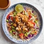 A vibrant and flavorful Asian Chicken Salad featuring marinated chicken cooked on skewers with a rich peanut sauce, served atop a crunchy cabbage slaw with peanuts and edamame for added texture and freshness. This recipe offers both air fryer and grill cooking methods for tender, juicy chicken infused with tangy and sweet peanut flavors.