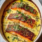 This Baked Boursin Salmon Recipe combines tender, flaky salmon fillets with a creamy, garlicky Boursin cheese topping infused with lemon and herbs. Baked to perfection at 400°F, this elegant yet easy dish offers a rich, flavorful meal ideal for weeknight dinners or special occasions, garnished with fresh parsley and served with vibrant sides.