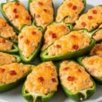 - Add Topping: Sprinkle about 1 teaspoon of extra shredded monterey jack cheese on top of each filled jalapeno for a cheesy crust.