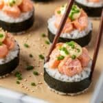 6. Top with Salmon Mixture: Place about 2 tablespoons of the marinated salmon mixture on top of the rice in each nori cup, spreading it evenly.