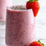 A tall clear glass filled with a thick, creamy pink smoothie with tiny dark seeds and fruit bits mixed throughout, topped with scattered small black chia seeds on the surface, and a large bright red strawberry with green leaves resting on the rim of the glass, all set against a bright white marbled background. photo taken with an iphone --ar 4:5 --v 7