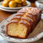 A golden brown loaf cake is sliced into eight even pieces, each slice showing a soft, moist light brown inside with a slightly darker, caramelized crust on the bottom and sides. The top of the cake is coated with a layer of coarse white sugar crystals that add a sparkling texture. The cake is placed on a white plate with delicate black floral patterns along the edge. The background features a white marbled surface with blurred hints of yellow apples and another white plate holding round golden pastries. photo taken with an iphone --ar 4:5 --v 7
