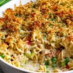 This best tuna casserole recipe is a comforting and hearty dish featuring tender egg noodles, savory sautéed vegetables, tuna, and a creamy mushroom soup base, all topped with a crispy cheesy breadcrumb crust. Perfect for an easy weeknight dinner that everyone will love.