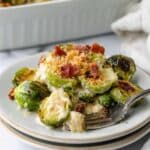 PrintBrussels Sprout Casserole with Bacon, Gruyere, and Crispy Cracker Topping Recipe
