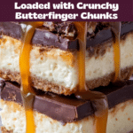 Indulge in rich, creamy Butterfinger Caramel Cheesecake Bars that combine a buttery graham cracker crust, smooth cheesecake filling studded with Butterfinger candy chunks, topped with luscious caramel sauce and extra Butterfinger pieces. Perfectly baked and chilled to set, these bars offer a delightful blend of textures and flavors, ideal for dessert lovers who enjoy a candy-inspired twist on classic cheesecake.