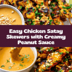 Chicken Satay is a flavorful Southeast Asian grilled dish that’s perfect for weeknight dinners or casual gatherings. Tender strips of marinated chicken are threaded onto skewers and grilled to perfection, offering a delicious blend of savory, tangy, and aromatic spices.