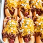 - Step 2: In a 9×13-inch or similarly sized casserole dish, arrange the hot dog buns cut side up. Place one hot dog inside each bun and spoon about 1/4 cup of chili over each hot dog. Sprinkle the shredded cheddar cheese evenly over the entire casserole.