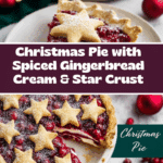 This Christmas Pie features a flaky double crust filled with a spiced gingerbread-inspired cream made from a rich vanilla custard layer topped with a warm fruit filling of cranberries, cherries, and apple, accented with orange zest and warming spices. It’s a festive dessert perfect for the holiday season, combining creamy textures and fruity spices under a beautiful star-patterned crust.