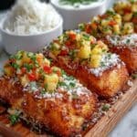 Keywords: coconut crusted salmon, pineapple salsa, baked salmon, tropical salmon recipe, seafood dinner, healthy salmon dish, easy salmon recipe