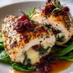 This Cranberry & Spinach Stuffed Chicken with Brie recipe offers a delightful combination of savory, creamy, and slightly sweet flavors wrapped in a juicy chicken breast. Perfect for a healthy and elegant dinner, this dish combines tender sautéed spinach, tart dried cranberries, and rich brie cheese, all baked to perfection for a luscious meal that will impress your guests or family.