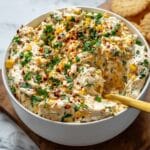 This dip pairs well with tortilla chips, crackers, toasted baguette slices, or fresh vegetable sticks like celery, carrots, and cucumber for a crunchy contrast.