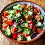Fattoush is a vibrant Middle Eastern salad known for its fresh vegetables and crispy toasted pita bread. This simple yet flavorful dish is perfect as a light lunch or a refreshing side.