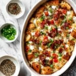 This savory Everything Bagel Breakfast Casserole combines the delicious flavors of everything bagels, bacon, bell pepper, and creamy cheeses into a hearty and satisfying baked breakfast dish. Perfect for brunch or a make-ahead breakfast, it’s loaded with textures from the crunchy bagel pieces and tender baked eggs, finished with optional everything bagel seasoning and fresh scallions for extra flavor.