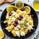 A black bowl filled with a simple pasta dish showing one layer of rigatoni pasta in a light beige color, topped with scattered dark red olives and white cubes and crumbles of soft cheese, garnished with small green herb sprigs and cracked black pepper. There are two lemon halves placed within the bowl, adding a bright yellow color. The bowl sits on a white marbled surface with a wooden spoon nearby and part of a white dish above containing lemon slices floating in a yellow liquid. photo taken with an iphone --ar 4:5 --v 7