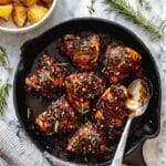 This Fig Glazed Skillet Chicken is a delightful dinner recipe featuring tender, juicy chicken pieces roasted in a buttery, garlic, and rosemary mixture, then glazed with a sweet and tangy fig and balsamic vinegar sauce. The sticky glaze perfectly balances savory and sweet flavors for a deliciously unique meal that’s easy to prepare using a cast iron skillet and oven roasting.