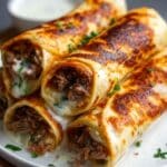 Store leftover roll ups in an airtight container in the refrigerator for up to 3 days. Reheat in the oven at 350°F (175°C) for 8–10 minutes to keep the tortillas crisp. Au jus can be stored separately in the fridge for up to 4 days and reheated gently on the stove.