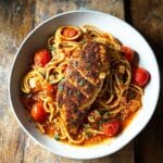 This Garlic Tomato Chicken with Mozzarella recipe features tender, seared chicken fillets cooked in a fragrant tomato and garlic sauce, enriched with fresh basil and melted mozzarella cheese. Perfectly balanced with savory seasonings and a touch of spice, it’s a comforting and flavorful dinner option that can be finished on the stovetop or baked in the oven for a golden cheesy crust.