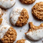 These Gingerbread Latte Cookies perfectly blend warm spices with a rich espresso flavor, all wrapped up in a chewy oat cookie. Topped with a luscious white chocolate dip and a sprinkle of cinnamon and nutmeg, they make a cozy treat for the holiday season or any time you crave a festive twist on a classic cookie.