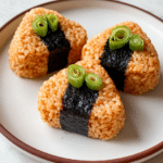 - Serve: After chilling, unwrap each onigiri and optionally wrap two sides with a slice of nori. Sprinkle with finely chopped spring onion for extra freshness and crunch. Enjoy immediately or keep refrigerated until serving.