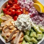 Keywords: Greek chicken bowl, air fryer chicken, Greek salad bowl, tzatziki sauce, healthy chicken recipe, Mediterranean chicken bowl