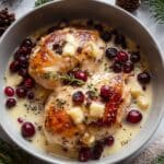 This Impressive Cranberry Brie Stuffed Chicken recipe combines juicy chicken breasts with a creamy brie cheese filling and a tangy-sweet homemade cranberry sauce. The chicken is seared to a golden brown and finished in the oven with a buttery panko breadcrumb topping, delivering a delightful mix of textures and flavors perfect for holiday dinners or special occasions.
