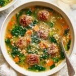 Italian Wedding Soup is a comforting and hearty dish featuring tender turkey meatballs, delicate orzo pasta, and fresh spinach, all simmered in a flavorful chicken broth. This classic Italian-American soup combines savory meat, pasta, and greens for a delicious and nourishing meal perfect for family dinners.