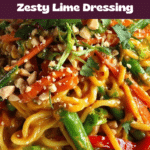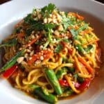Laab Noodle Salad is a vibrant and flavorful Thai-inspired dish combining tender rice vermicelli noodles, caramelized ground beef, charred green beans, and fresh vegetables like romaine lettuce, cherry tomatoes, and bell pepper. Tossed in a tangy and spicy lime and fish sauce dressing with hints of garlic and bird’s-eye chili, this salad delivers a perfect balance of textures and bold flavors, making it an ideal light yet satisfying meal.