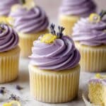 These lemon lavender cupcakes blend bright citrus with delicate floral notes for a refreshing springtime treat. Soft and buttery, the cupcakes feature crushed culinary lavender in the batter and a creamy lavender frosting, topped with lemon zest and dried lavender buds.
