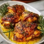 A close-up view of four golden-brown roasted chicken thighs with crispy, seasoned skin, placed meat-side down on a white oval plate. The chicken pieces rest in a pool of glossy, yellow-golden sauce with small herbs sprinkled on top. Fresh sprigs of bright green rosemary lie on and around the chicken, adding contrast to the rich, warm colors of the dish. The plate sits on a white marbled surface with another plate of similar chicken blurred in the background. photo taken with an iphone --ar 4:5 --v 7