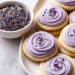 - Frost Cookies: Once the cookies have cooled, spread about 1 tablespoon of the lavender cream cheese frosting evenly on each cookie using a mini offset spatula for a smooth finish.