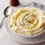 - Season and Garnish: Season with salt and pepper to taste. Serve the mashed potatoes warm, garnished with finely chopped chives, a drizzle of olive oil, and an extra sprinkle of pepper if desired.