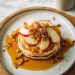 A stack of three golden-brown pancakes sits in the center of a white plate with a thin gray rim. Between and on top of the pancakes, thin, light beige apple slices with red edges are layered evenly. The top layer is garnished with a sprinkle of crunchy granola and is drizzled generously with amber-colored syrup that pools around the base of the stack. The plate rests on a white marbled surface. Photo taken with an iphone --ar 4:5 --v 7