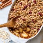 - Assemble the Crisp: Transfer the apple filling mixture into a 9×5 inch baking dish, spreading it out evenly. Sprinkle the oat crisp topping evenly over the apple layer to cover it completely.