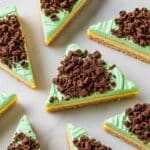 These Mint Chocolate Chip Cookies feature a tender buttery base with a refreshing peppermint flavor, topped with a vibrant minty blue-green white chocolate layer and bittersweet dark chocolate chips. Perfectly baked to a golden edge and cooled to achieve the ideal texture, these cookies offer a delightful balance of mint and chocolate with a visually appealing finish.