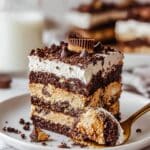 This indulgent, no-bake chocolate peanut butter cake combines creamy peanut butter mousse, luscious whipped cream, crunchy graham cracker crumble, and rich hot fudge layers for a decadent dessert that requires no baking. Perfectly layered with Reese’s peanut butter cups and chocolate chips, this cake is chilled until the graham crackers soften to a cake-like texture, making it an easy and impressive treat to enjoy.