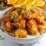 This Orange Chicken recipe features tender, bite-sized pieces of chicken breast sautéed to golden perfection and coated in a tangy-sweet Florida orange juice glaze infused with garlic, honey, soy sauce, and fragrant spices. Garnished with green onions and toasted sesame seeds, this flavorful dish is perfect served over steamed rice for a quick and delicious meal.