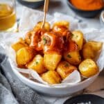 Store leftover potatoes and sauce separately in airtight containers in the refrigerator for up to 2 days. Reheat the potatoes in an oven or air fryer to regain crispness, and warm the sauce gently on the stove before serving.