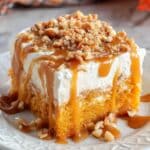 This moist and flavorful Pumpkin Cake combines the warm spices of pumpkin with a rich, creamy topping of sweetened condensed milk and Cool Whip, topped with crunchy Heath bits and drizzled with caramel sauce for an indulgent autumn dessert perfect for gatherings and holiday celebrations.