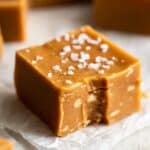 A close-up of a single thick square piece of light brown fudge with a smooth and slightly shiny texture, showing tiny nugget-like pieces inside the fudge. The top layer is sprinkled with a few coarse white salt crystals. The fudge sits on a piece of white parchment paper on a white marbled surface with soft focus pieces of more fudge blurred in the background. Photo taken with an iphone --ar 4:5 --v 7