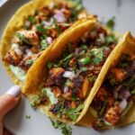 These Ridiculously Good Chicken Tacos feature juicy, golden chicken thighs seasoned with taco spices and cooked to perfection in an air fryer. Topped with a creamy, tangy green sauce made from avocado, mayo, lime, garlic, and cilantro, and garnished with fresh cilantro, diced onion, and cotija cheese, these tacos offer a flavorful, easy-to-make meal perfect for any taco night.