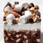 6. Add toppings: Once the base is cooled, spread 1 cup of Marshmallow Fluff evenly over the top. Then, scatter 1 cup miniature marshmallows, ½ cup chopped toasted pecans, and ⅓ cup semisweet chocolate chips evenly over the Fluff. Gently press these toppings down so they adhere to the surface.
