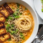 - Serve: Ladle broth into bowls, adding noodles and mushrooms. Top with the crispy tofu, a squeeze of lime, lime wedges, sliced green onions, and sesame seeds. Enjoy immediately.