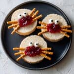 These Spooky Spider Sandwiches are a fun and festive Halloween treat perfect for parties or lunchboxes. Made with peanut butter and strawberry jelly between soft bread rounds, each sandwich is decorated with pretzel stick legs and candy eyes to create adorable spider shapes that kids and adults will love.