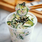 This Sushi Cucumber Salad is a refreshing and nutritious dish that comes together quickly with minimal effort. Packed with creamy dressing and flavorful toppings, it makes a perfect light meal or side dish full of vibrant textures and tastes.