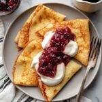 This Swedish Pancakes recipe features thin, delicate pancakes with a lacy edge, perfect for breakfast or brunch. Served traditionally with lingonberry or blueberry jam and plain yogurt, these pancakes deliver a light, tender texture and subtle sweetness. Made with simple ingredients and cooked on the stovetop, they are a delightful twist on classic American pancakes, ideal for those who enjoy a more refined and elegant pancake experience.