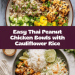 These Thai Peanut Chicken Bowls are a vibrant and flavorful meal perfect for busy weeknights. Featuring tender chicken in a creamy peanut sauce, fresh Thai-style slaw, and a bed of cauliflower rice, they offer a delicious balance of savory, tangy, and crunchy elements.