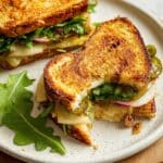 - Assemble the Sandwich: Remove from oven and top the melted cheese with pickled jalapeños. Spread dijon mustard on the plain bread slice, then drizzle honey on top. Layer apple slices, red onion, arugula, and kettle chips over the honey-spread bread slice.