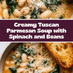 Tuscan Parmesan Cream Soup is a comforting and creamy dish that combines tender beans, fresh spinach, and savory Parmesan cheese. This flavorful soup is perfect for a cozy meal and comes together quickly with simple ingredients.
